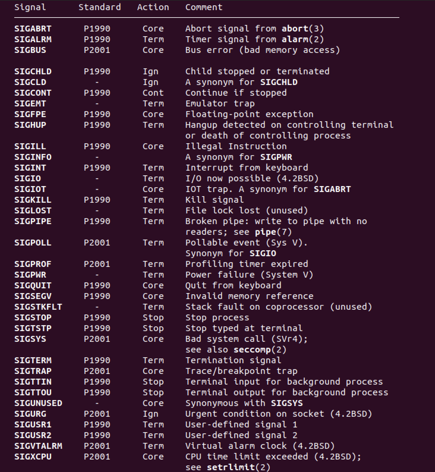 $man 7 signal을 들어가면 signal 내용을 볼 수 있다.
