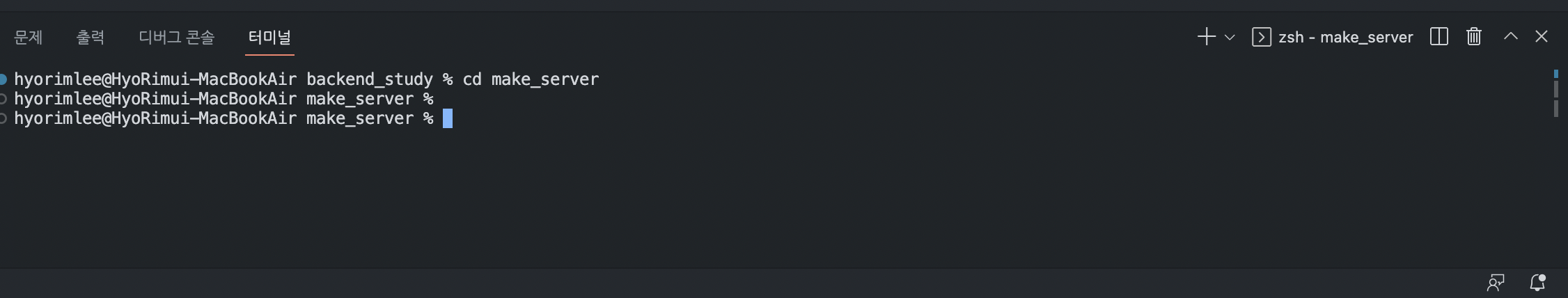 그 다음 Ctrl+` 단축키로 터미널을 열어서 디렉토리가 make_server를 제대로 가리키도록 합니다.