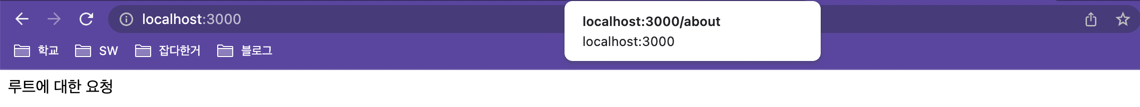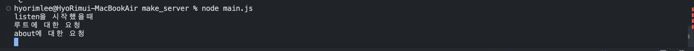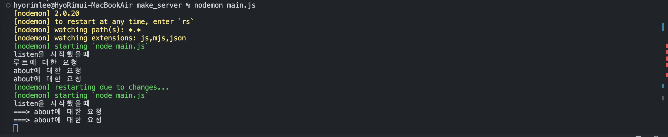터미널에서 서버를 재시작하고 localhost:3000과 localhost:3000/about을 실행시키면 터미널에 요청이 들어옵니다.
