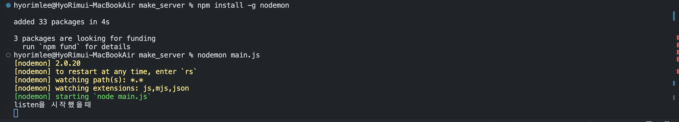 코드를 살짝 바뀌었을 경우 nodemon이 알아서 재실행합니다.