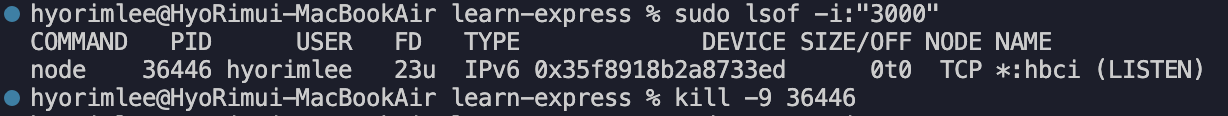 저는 포트번호 3000번을 쓰고 있었기때문에 sudo lsof -i:"3000" 으로 했습니다. 이 명령어를 사용했더니 PID가 36446으로 나와서 kill -9 36446 명령어를 입력했습니다. 개개인마다, 프로그램마다 당연히 PID는 다르기때문에 꼭 직접 명령어 쳐보고 자기 PID를 확인해보시길 바랍니다.