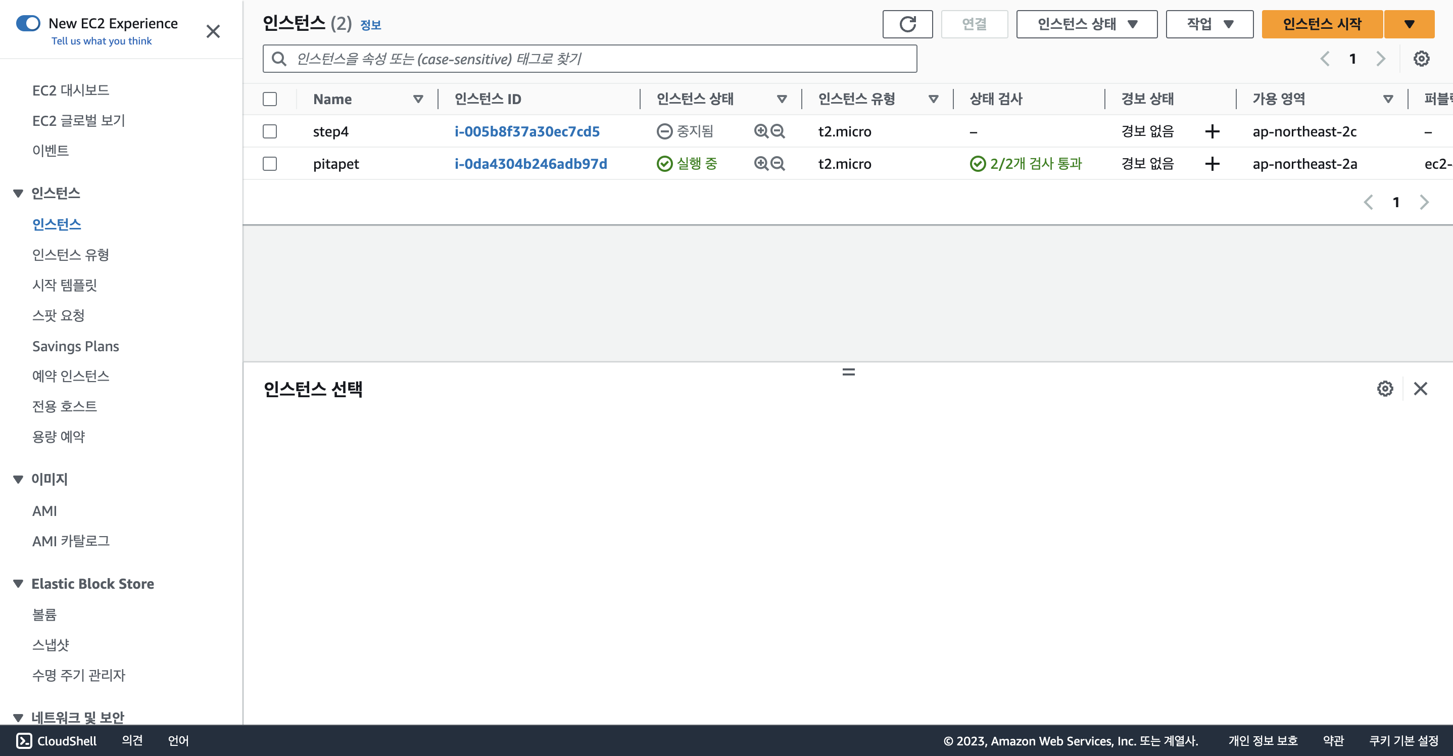 좌측의 탭에서 인스턴스-인스턴스를 클릭하면 다음과 같은 화면이 나타납니다.