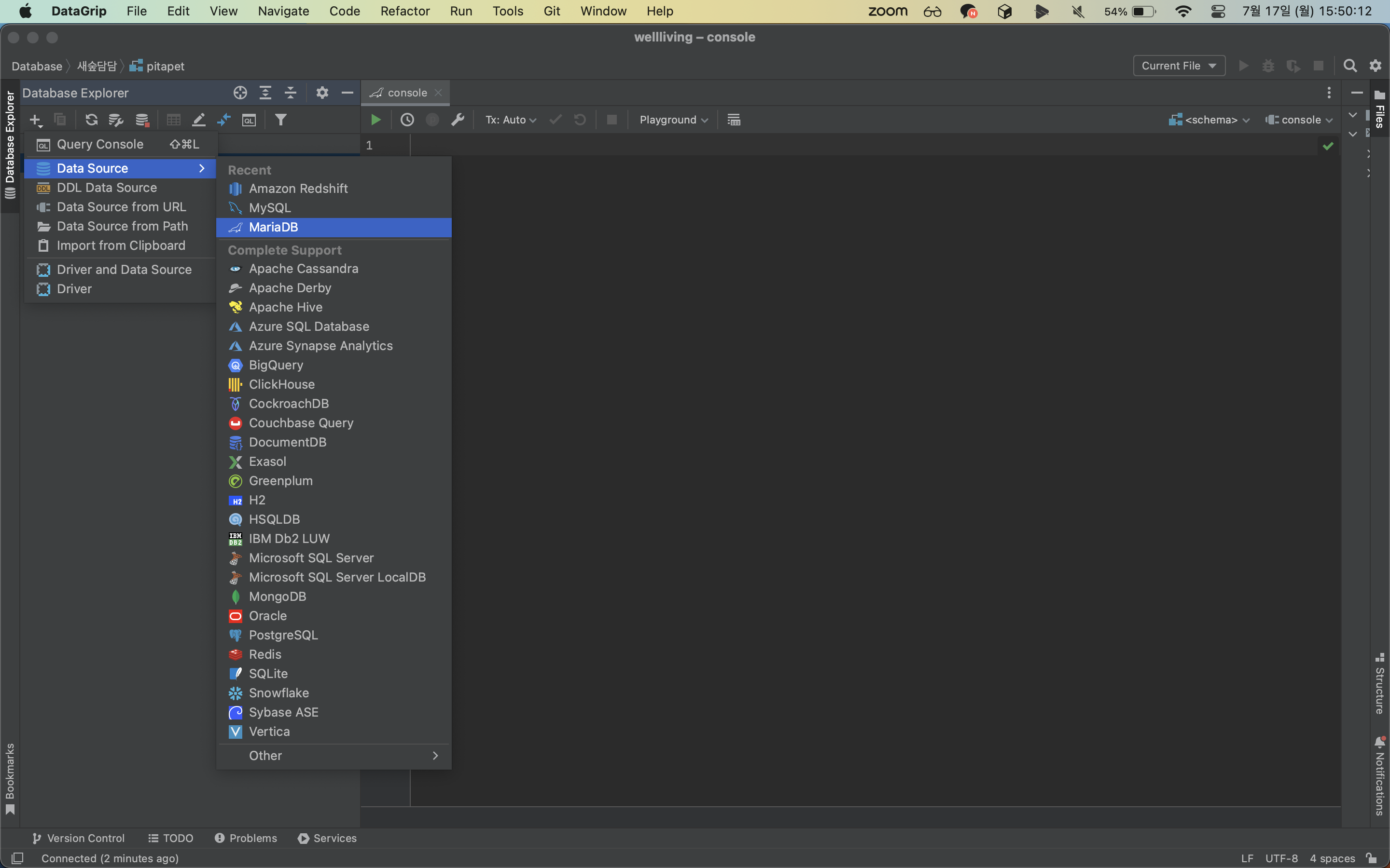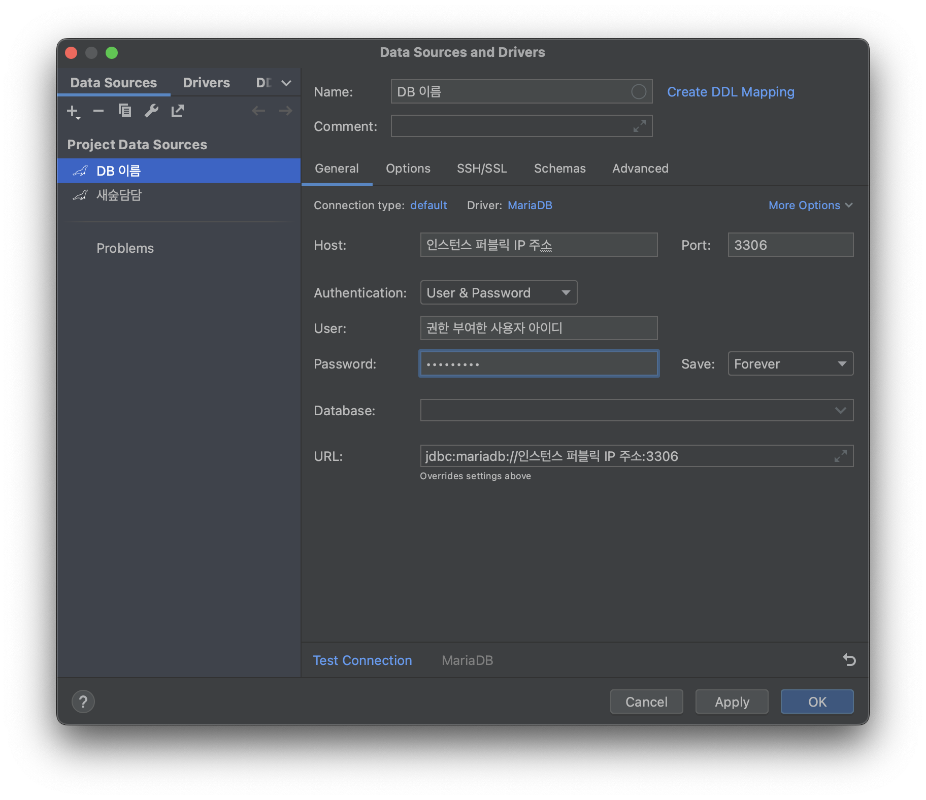 Database Explorer 밑에 있는 + 버튼 -> Data Source -> MariaDB 를 누르면 우측 사진과 같은 창이 뜹니다.