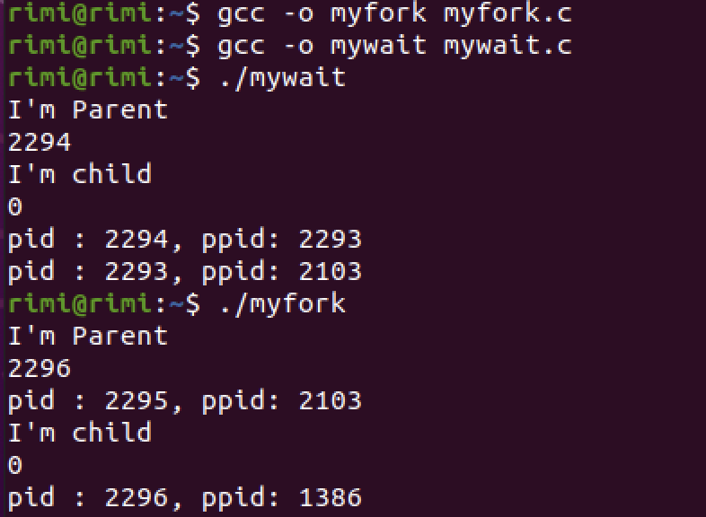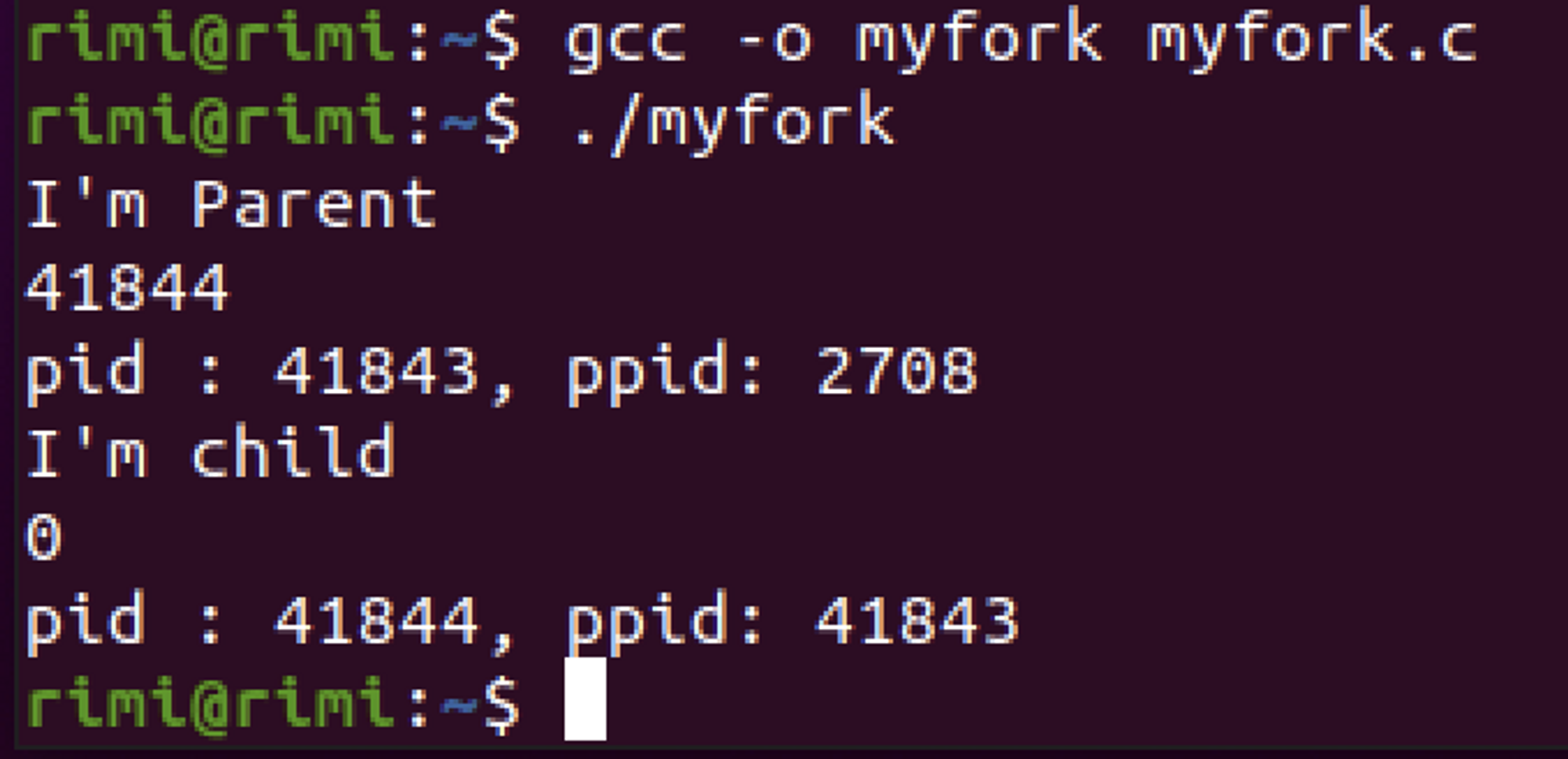 fork 하는 순간 parent 프로세스에서 리턴 한 번, child 프로세스에서 리턴 한 번해서 리턴을 총 두번합니다! 밑의 코드는 fork()의 리턴값에 따라 자식 프로세스인지 부모 프로세스인지 구별해서 각각 프로세스의 pid를 출력하는 코드입니다.